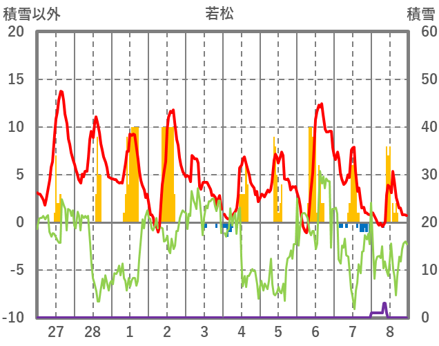 | 日 | 時 | 気温 | 降水 | 風向/風速 | 日照 | 積雪 | 降雪 |