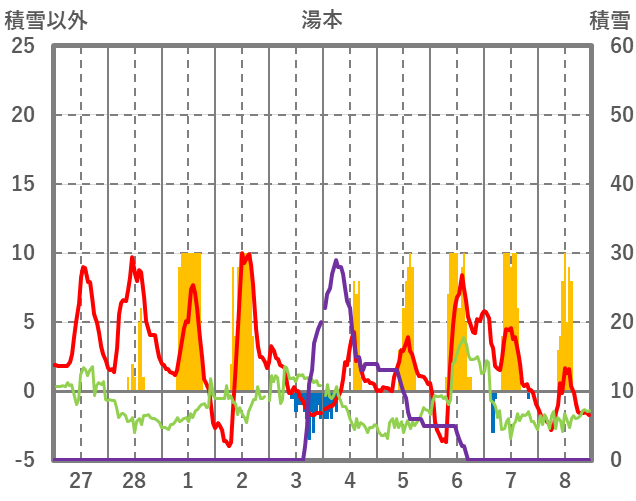 | 日 | 時 | 気温 | 降水 | 風向/風速 | 日照 | 積雪 | 降雪 |