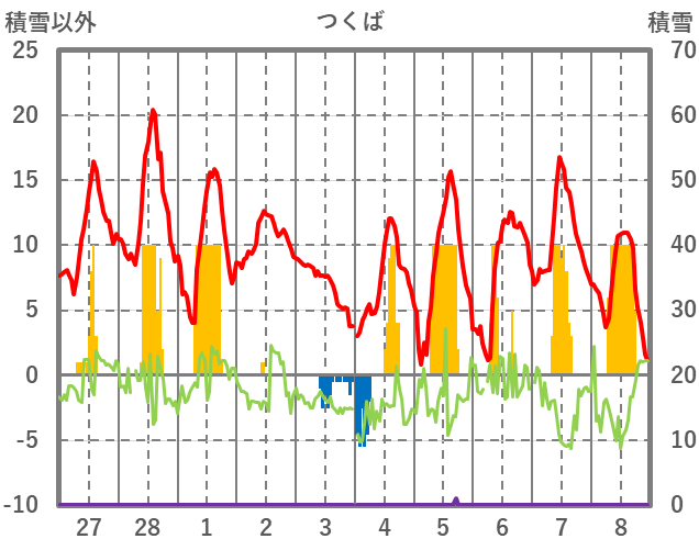 | 日 | 時 | 気温 | 降水 | 風向/風速 | 日照 | 積雪 | 降雪 |