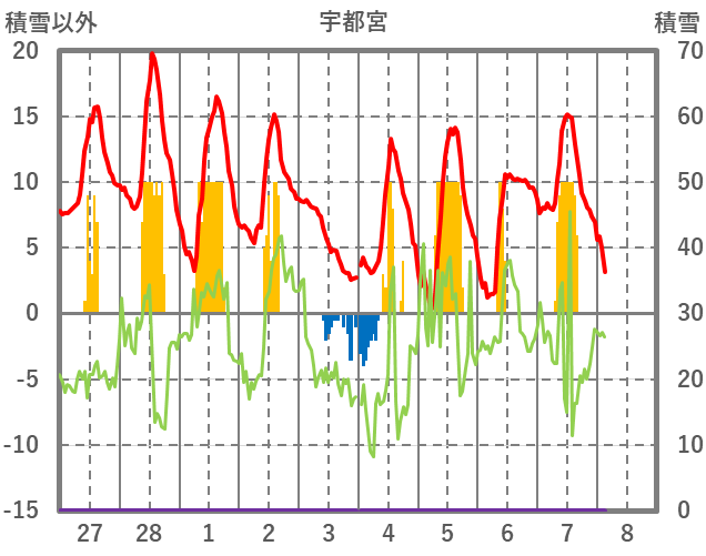 | 日 | 時 | 気温 | 降水 | 風向/風速 | 日照 | 積雪 | 降雪 |