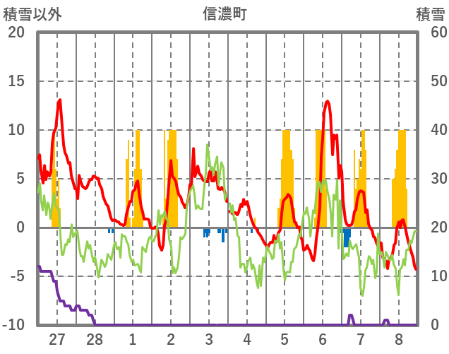 | 日 | 時 | 気温 | 降水 | 風向/風速 | 日照 | 積雪 | 降雪 |