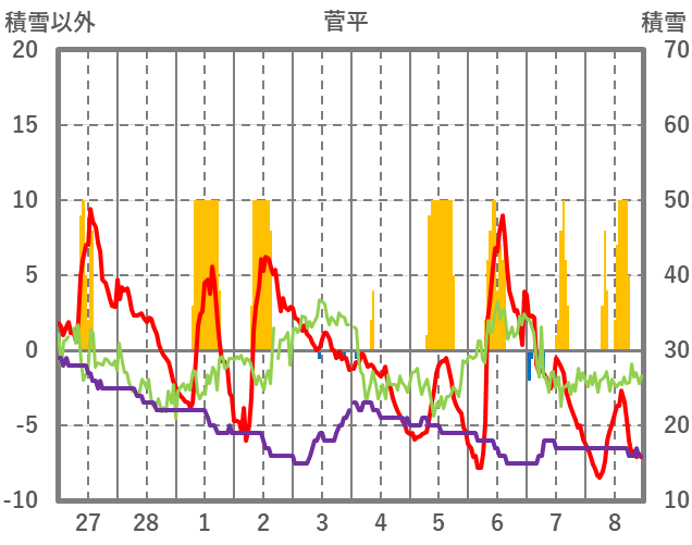 | 日 | 時 | 気温 | 降水 | 風向/風速 | 日照 | 積雪 | 降雪 |