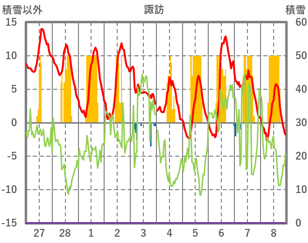 | 日 | 時 | 気温 | 降水 | 風向/風速 | 日照 | 積雪 | 降雪 |