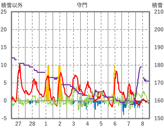 | 日 | 時 | 気温 | 降水 | 風向/風速 | 日照 | 積雪 | 降雪 |