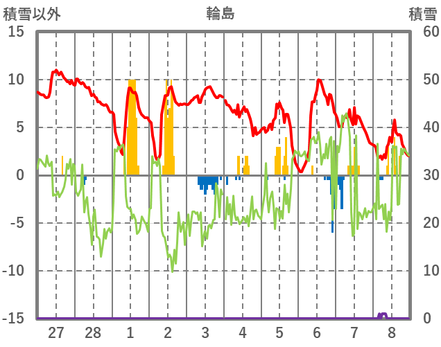 | 日 | 時 | 気温 | 降水 | 風向/風速 | 日照 | 積雪 | 降雪 |