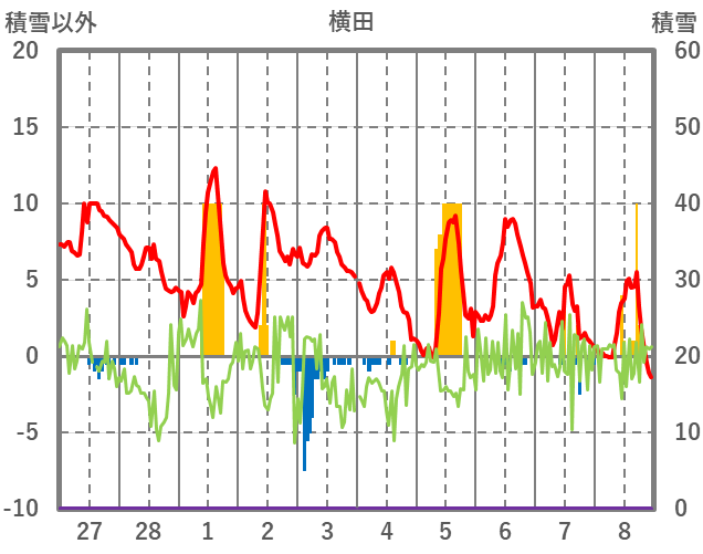 | 日 | 時 | 気温 | 降水 | 風向/風速 | 日照 | 積雪 | 降雪 |