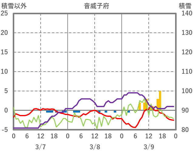 | 日 | 時 | 気温 | 降水 | 風向/風速 | 日照 | 積雪 | 降雪 |