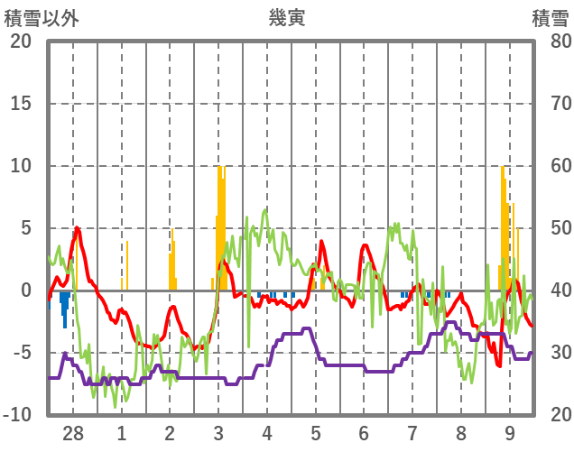 | 日 | 時 | 気温 | 降水 | 風向/風速 | 日照 | 積雪 | 降雪 |
