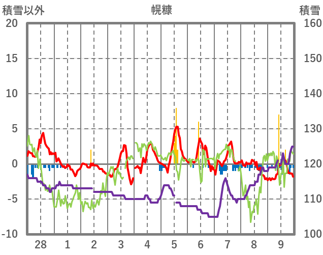 | 日 | 時 | 気温 | 降水 | 風向/風速 | 日照 | 積雪 | 降雪 |