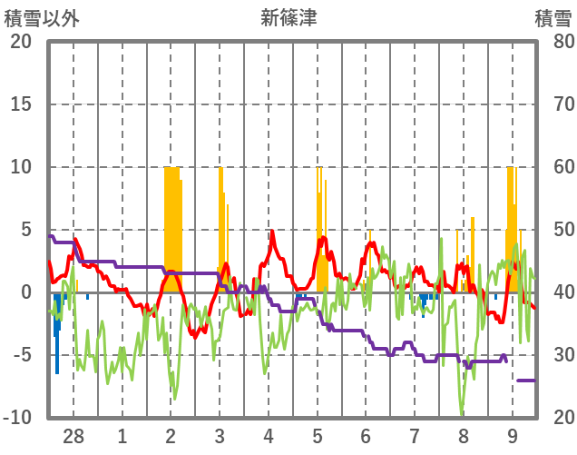 | 日 | 時 | 気温 | 降水 | 風向/風速 | 日照 | 積雪 | 降雪 |