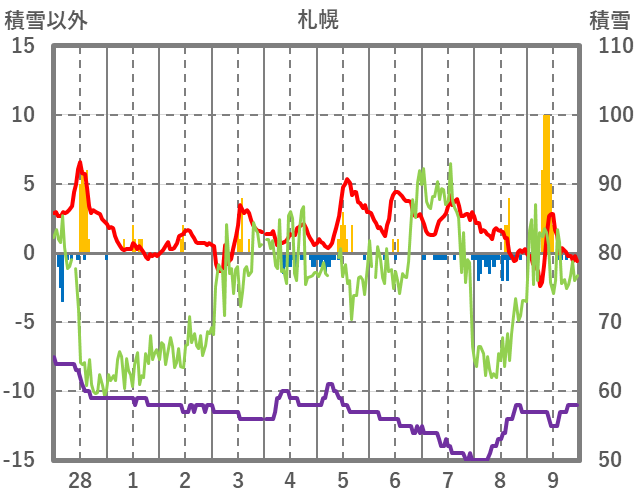 | 日 | 時 | 気温 | 降水 | 風向/風速 | 日照 | 積雪 | 降雪 |
