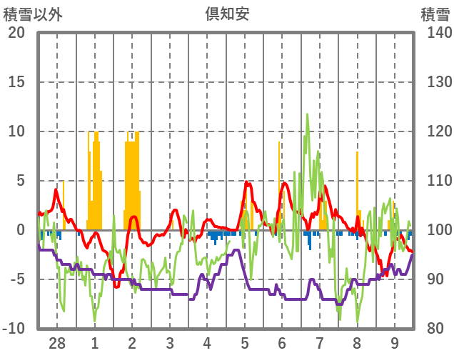| 日 | 時 | 気温 | 降水 | 風向/風速 | 日照 | 積雪 | 降雪 |