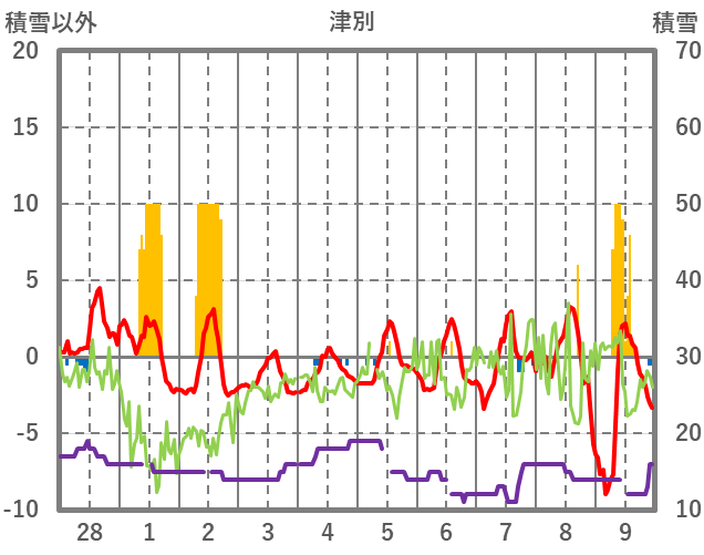| 日 | 時 | 気温 | 降水 | 風向/風速 | 日照 | 積雪 | 降雪 |