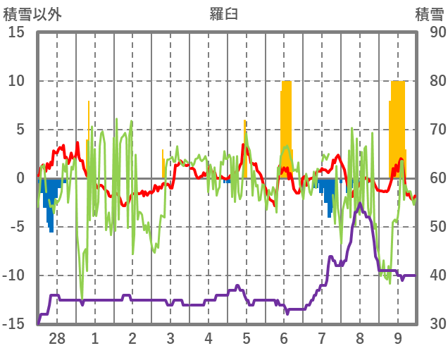 | 日 | 時 | 気温 | 降水 | 風向/風速 | 日照 | 積雪 | 降雪 |