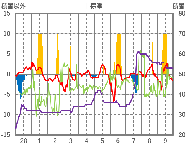 | 日 | 時 | 気温 | 降水 | 風向/風速 | 日照 | 積雪 | 降雪 |