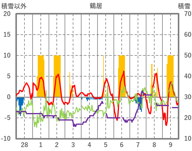 | 日 | 時 | 気温 | 降水 | 風向/風速 | 日照 | 積雪 | 降雪 |