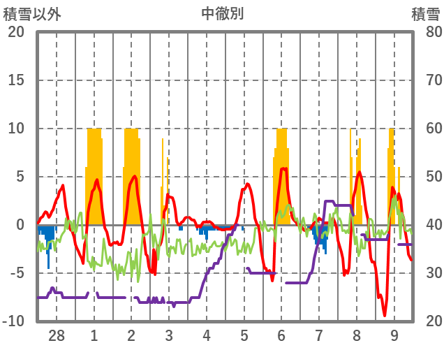 | 日 | 時 | 気温 | 降水 | 風向/風速 | 日照 | 積雪 | 降雪 |