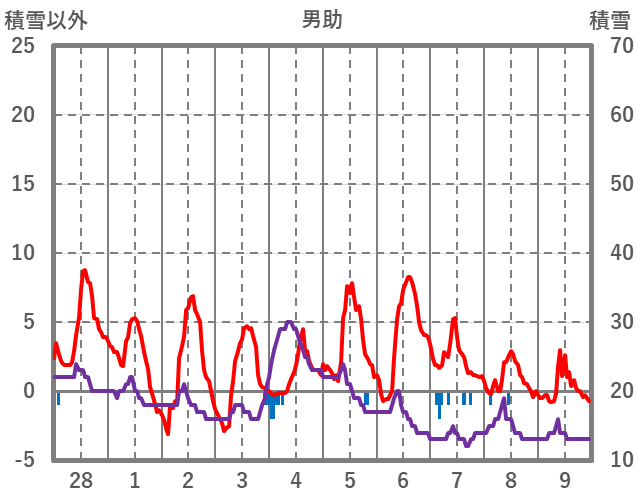 | 日 | 時 | 気温 | 降水 | 風向/風速 | 日照 | 積雪 | 降雪 |