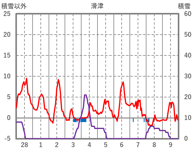 | 日 | 時 | 気温 | 降水 | 風向/風速 | 日照 | 積雪 | 降雪 |