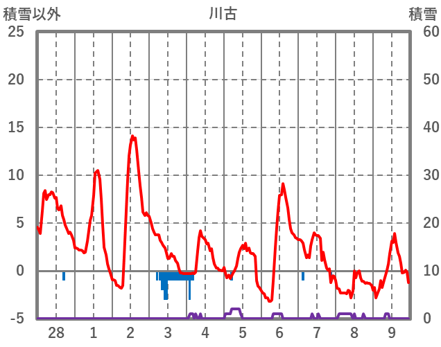 | 日 | 時 | 気温 | 降水 | 風向/風速 | 日照 | 積雪 | 降雪 |