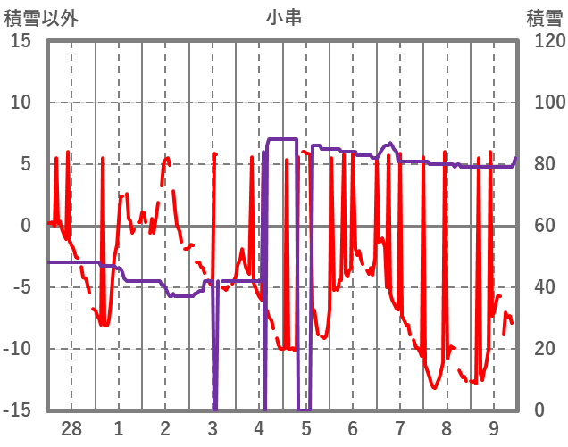 | 日 | 時 | 気温 | 降水 | 風向/風速 | 日照 | 積雪 | 降雪 |