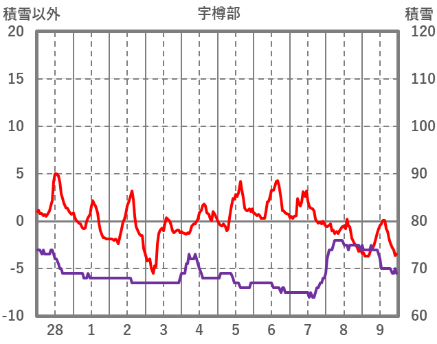| 日 | 時 | 気温 | 降水 | 風向/風速 | 日照 | 積雪 | 降雪 |