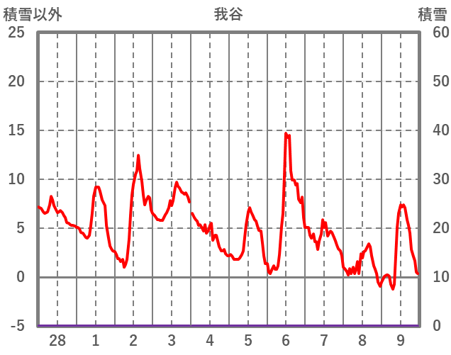 | 日 | 時 | 気温 | 降水 | 風向/風速 | 日照 | 積雪 | 降雪 |