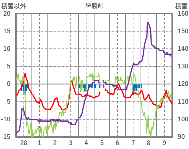 | 日 | 時 | 気温 | 降水 | 風向/風速 | 日照 | 積雪 | 降雪 |