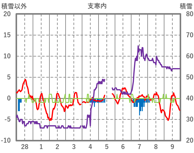 | 日 | 時 | 気温 | 降水 | 風向/風速 | 日照 | 積雪 | 降雪 |