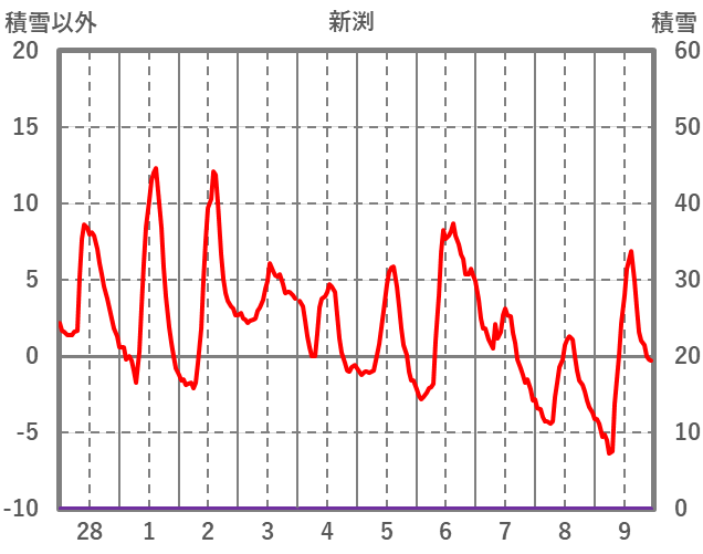 | 日 | 時 | 気温 | 降水 | 風向/風速 | 日照 | 積雪 | 降雪 |