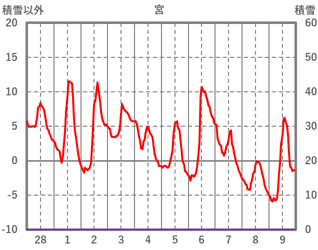 | 日 | 時 | 気温 | 降水 | 風向/風速 | 日照 | 積雪 | 降雪 |