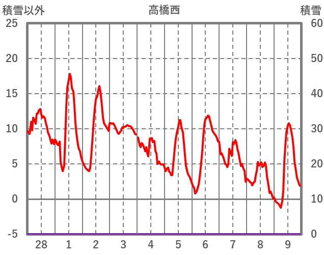 | 日 | 時 | 気温 | 降水 | 風向/風速 | 日照 | 積雪 | 降雪 |
