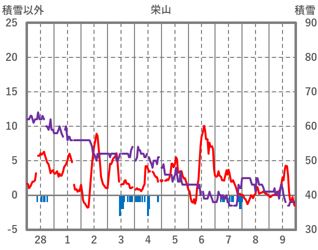 | 日 | 時 | 気温 | 降水 | 風向/風速 | 日照 | 積雪 | 降雪 |