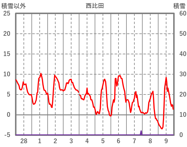 | 日 | 時 | 気温 | 降水 | 風向/風速 | 日照 | 積雪 | 降雪 |