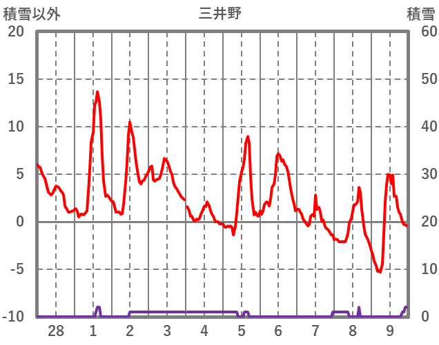 | 日 | 時 | 気温 | 降水 | 風向/風速 | 日照 | 積雪 | 降雪 |