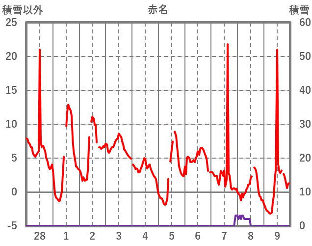 | 日 | 時 | 気温 | 降水 | 風向/風速 | 日照 | 積雪 | 降雪 |