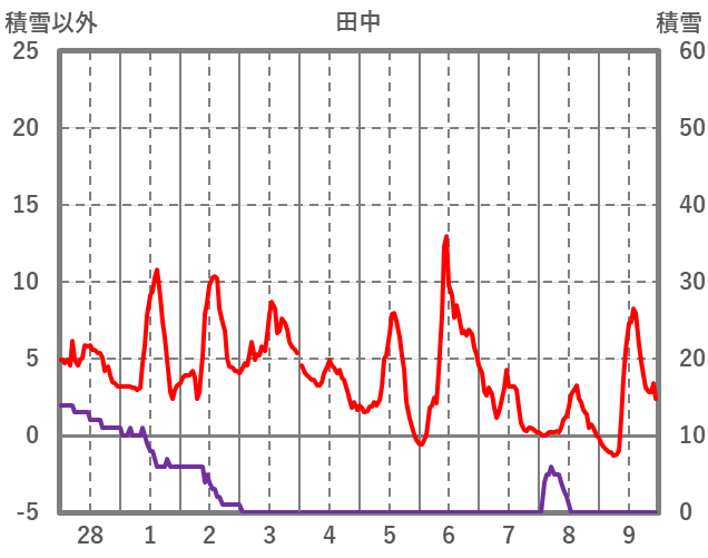 | 日 | 時 | 気温 | 降水 | 風向/風速 | 日照 | 積雪 | 降雪 |