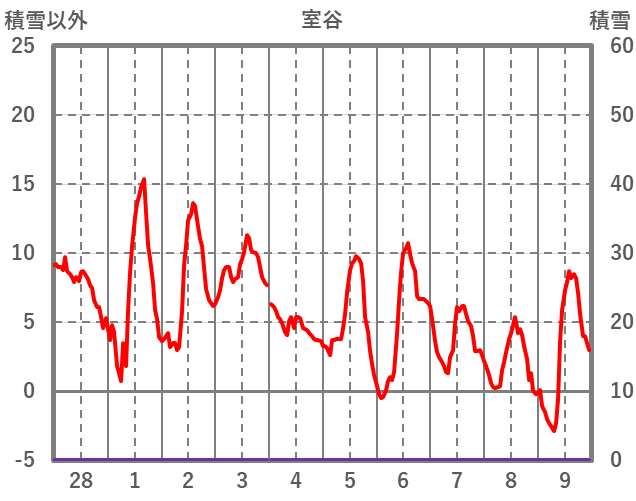 | 日 | 時 | 気温 | 降水 | 風向/風速 | 日照 | 積雪 | 降雪 |