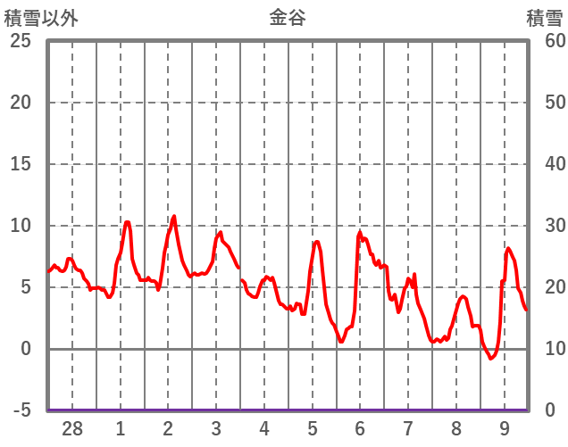 | 日 | 時 | 気温 | 降水 | 風向/風速 | 日照 | 積雪 | 降雪 |