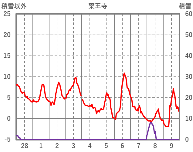 | 日 | 時 | 気温 | 降水 | 風向/風速 | 日照 | 積雪 | 降雪 |