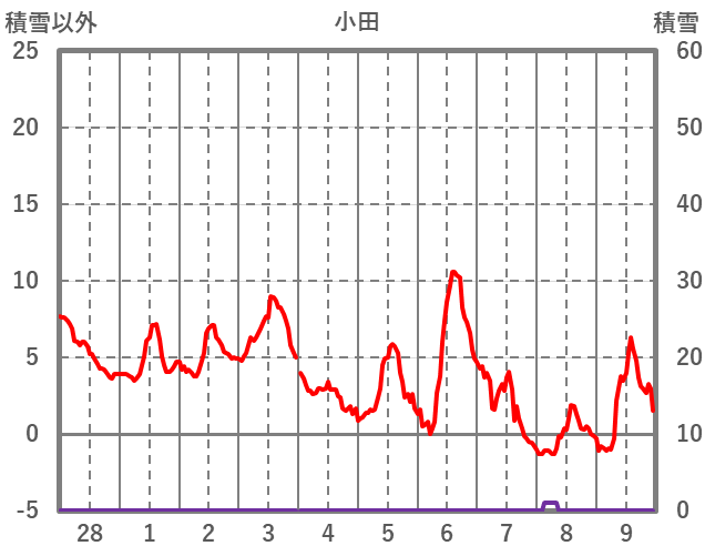 | 日 | 時 | 気温 | 降水 | 風向/風速 | 日照 | 積雪 | 降雪 |