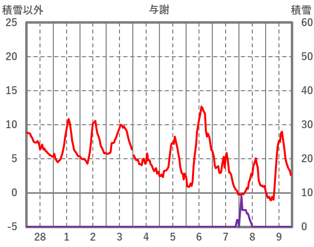 | 日 | 時 | 気温 | 降水 | 風向/風速 | 日照 | 積雪 | 降雪 |