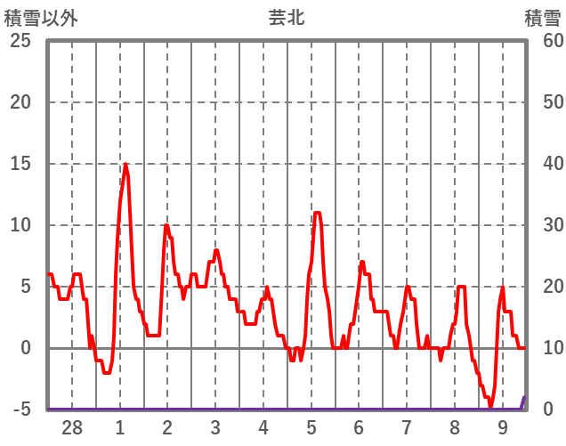 | 日 | 時 | 気温 | 降水 | 風向/風速 | 日照 | 積雪 | 降雪 |