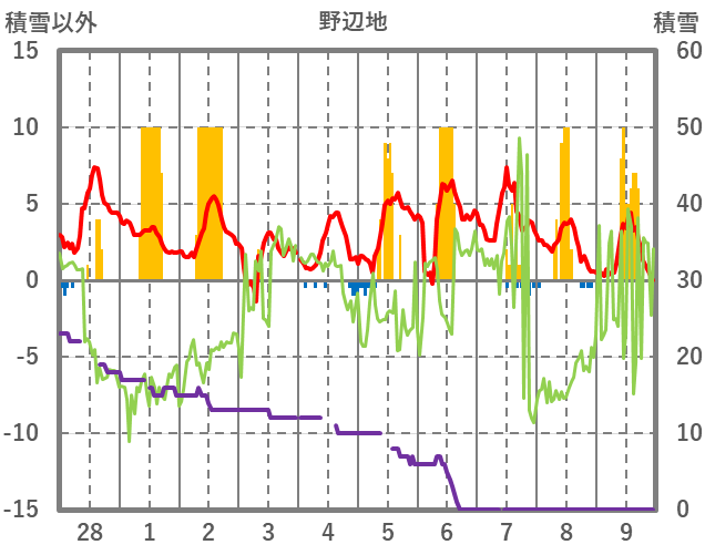 | 日 | 時 | 気温 | 降水 | 風向/風速 | 日照 | 積雪 | 降雪 |