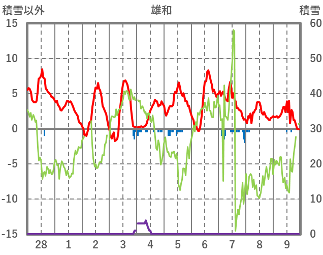 | 日 | 時 | 気温 | 降水 | 風向/風速 | 日照 | 積雪 | 降雪 |