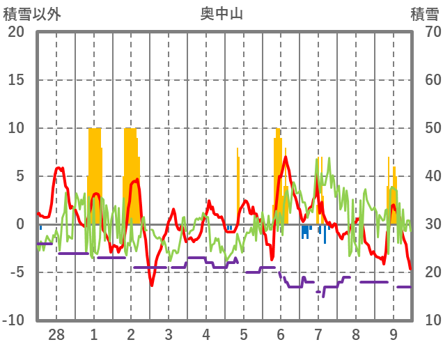 | 日 | 時 | 気温 | 降水 | 風向/風速 | 日照 | 積雪 | 降雪 |