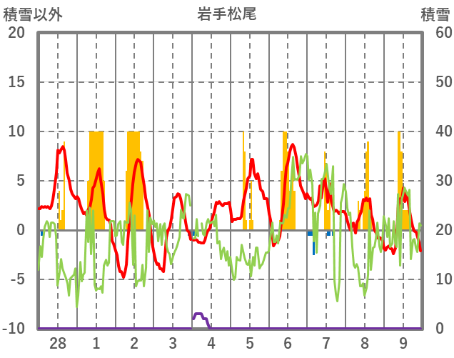 | 日 | 時 | 気温 | 降水 | 風向/風速 | 日照 | 積雪 | 降雪 |