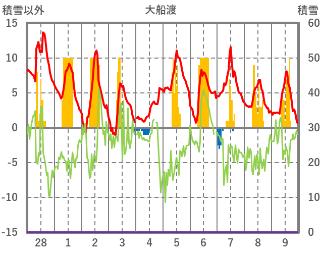 | 日 | 時 | 気温 | 降水 | 風向/風速 | 日照 | 積雪 | 降雪 |