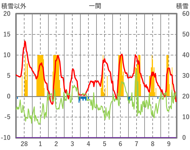 | 日 | 時 | 気温 | 降水 | 風向/風速 | 日照 | 積雪 | 降雪 |