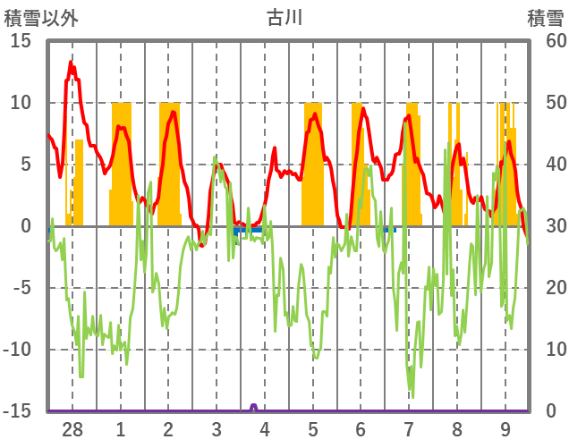 | 日 | 時 | 気温 | 降水 | 風向/風速 | 日照 | 積雪 | 降雪 |